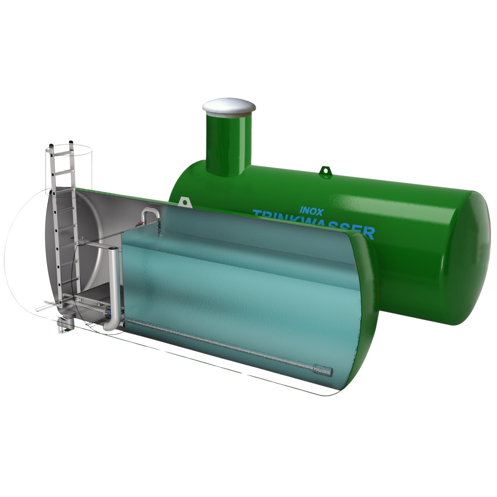Der Trinkwassertank erdverlegt aus Stahl mit Vorraum ist erhältlich in den Grössen 5000 L, 7000 L, 10000 L, 15000 L, 20000 L, 30000 L, 40000 L und 50000 L.
